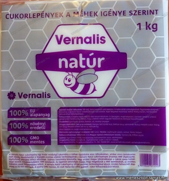 Egy kiváló minőségű takarmány a méhek táplálására azon időszakokban amikor nincs természetes méh eleség. Köszönhetően a legújabb enzimes eljárási technológiának a Vernalis Natúr cukorlepények ártalmas HMF (hydroxymethylfurfural) jelenléte nélkül készülnek. Számos tanulmány kimutatta, hogy amikor magas hőmérsékleten a cukrot savas hidrolízissel kezelik melléktermékként HMF keletkezik. Az egyetlen lehetséges módja, hogy megelőzzük a HMF keletkezését az enzimes hidrolízis savak felhasználása nélkül. A Vernalis Natúr cukorlepény német enzimes technológiával készül, minden felhasznált alapanyag az EU-ból származik. A lepény GMO mentes, és csak háztartási célra gyártott cukor felhasználásával készül.